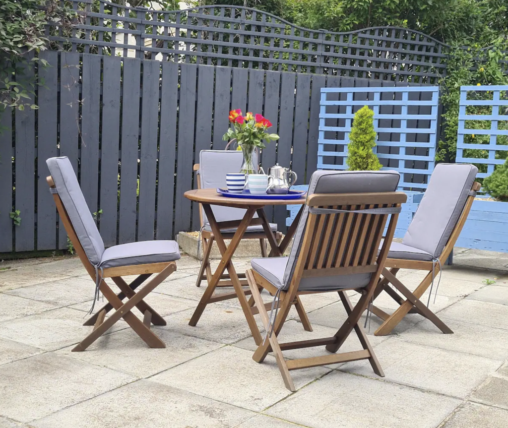 To the rear of the apartment, there is an enclosed courtyard with a seating area.